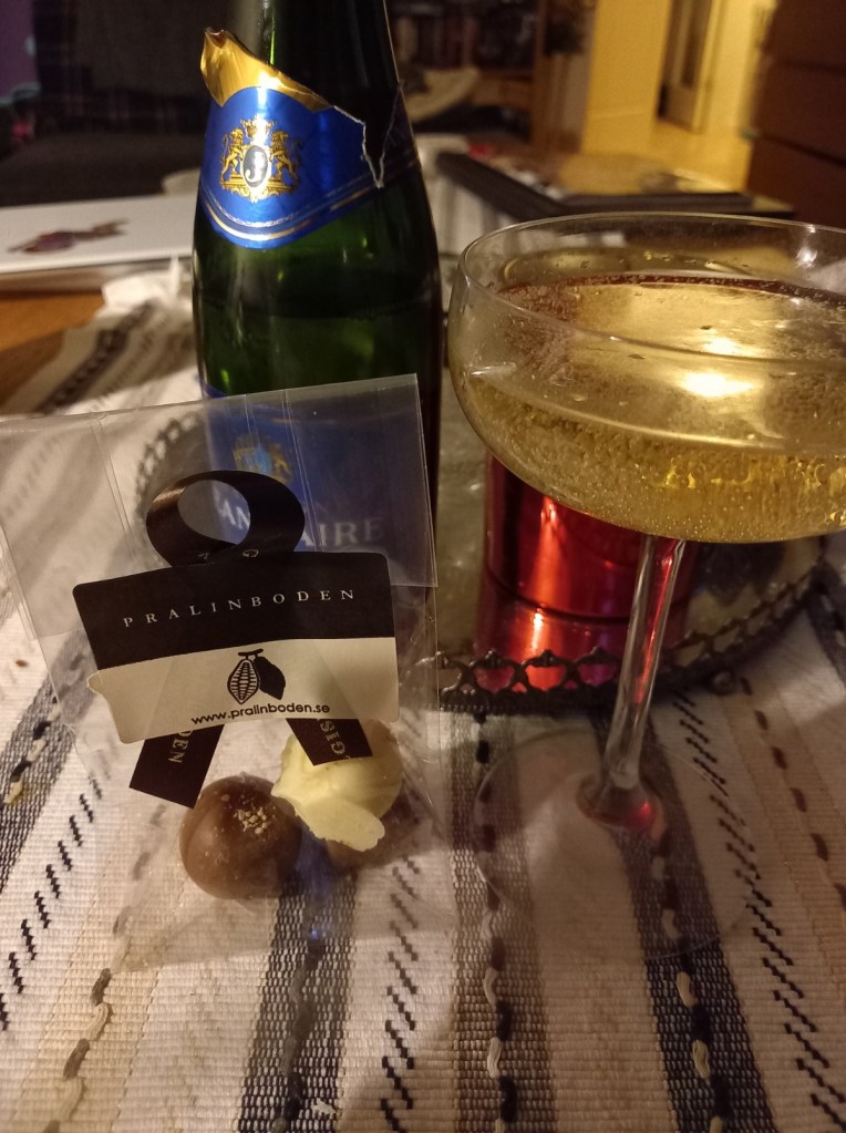 Visste ni att det är champagnens dag idag? Hörde det på radion på jobbet och jag en kollega började prata om det. Hon kände av fjärde dosen och jag är alltid seg och ensam hemma ikväll. Vi skojade om att vi skulle ha AW med champagne via facetime. Efter jobbet så åkte jag ner och köpte en liten flaska jeanmaire. En otroligt prisvärd champagne. Var positivt överraskad och har köpt den ett par gånger efter det. Samtidigt var det där pralinerna kom in. Choklad och champagne, vem kan motstå det?