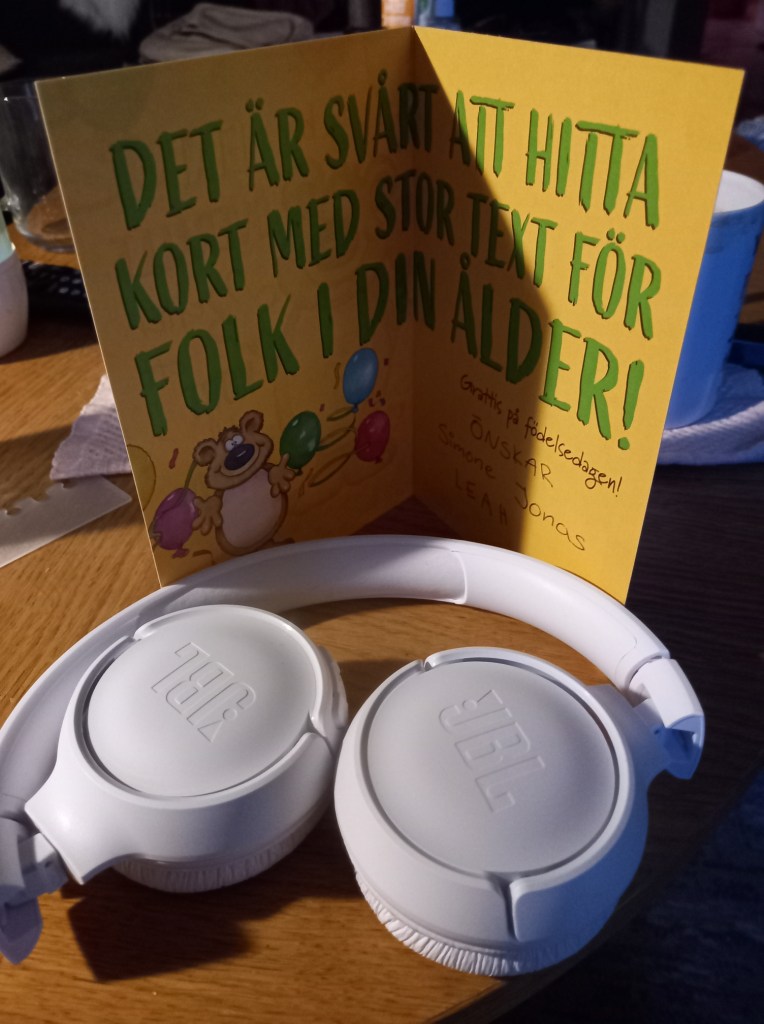 Berättade att vi var på kalas för barnbarnets katt i fredags. Min dotter har så svårt att hålla överraskningar så hon gav mig min present ifrån dom redan i fredags. Fick ett par hörlurar. Jag är ofta tät i gångarna så har så svårt för sådana där små lurar man stoppar i örat. Har jag inga lurar lyssnar jag allt för sällan på bok också så detta blir ju perfekt tycker jag.