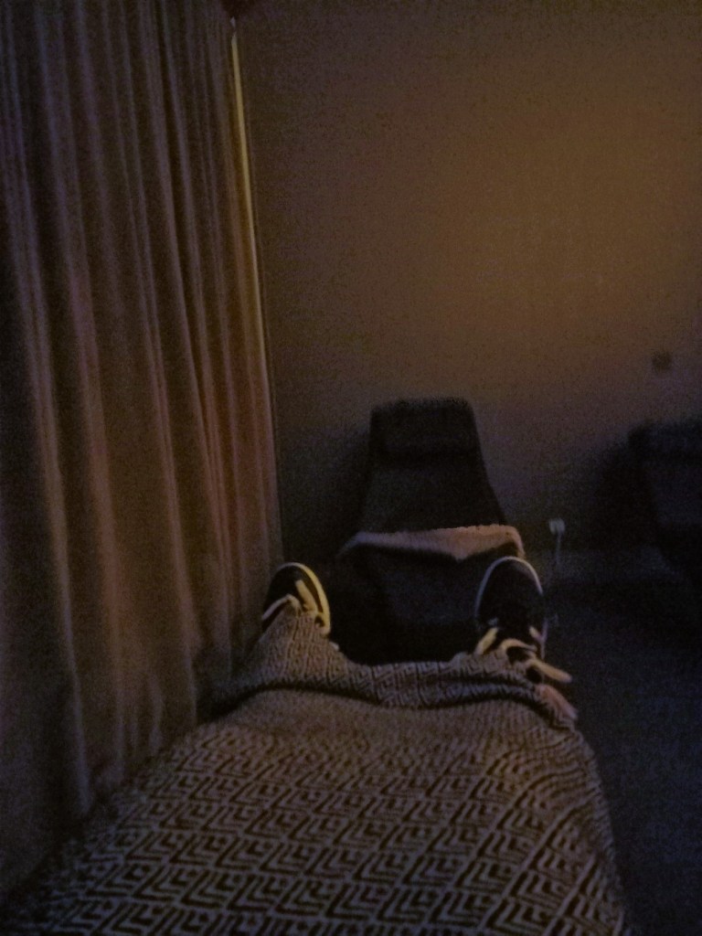 Det är ett väldigt mörkt rum ( därav de suddiga bilderna) och där kan man ha 20 minuter i vaggande fåtöljer. Det spelas lite avslappnande musik och man kan titta på på ”stjärnhimmelen” Väldigt lätt att somna, men som tur är så stängs det av automatiskt
