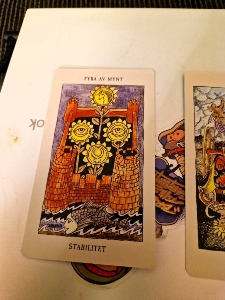 Olika lekar har olika ”symboler”. I min lek är det mynt, men kan även vara pentagram. Själva myntet symboliserar det materiella, den fysiska kroppen, och står i elementet jorden. Fyran symboliserar stabilitet, grundläggande behov och trygghet. Det är med all säkerhet det jag söker. Då jag skulle skriva var jag helt inne på två av mynt, vilket står för en förändring. Tänkte att det måste ha något budskap det också. Förändringar behöver jag också just nu. Ännu viktigare är att titta på kortet. Vad ser man? Det första jag drogs till var kvinnotecknet, och fisken som simmar mot strömmen. Där har jag mina tankar, och genast fick kortet en helt annan betydelse.