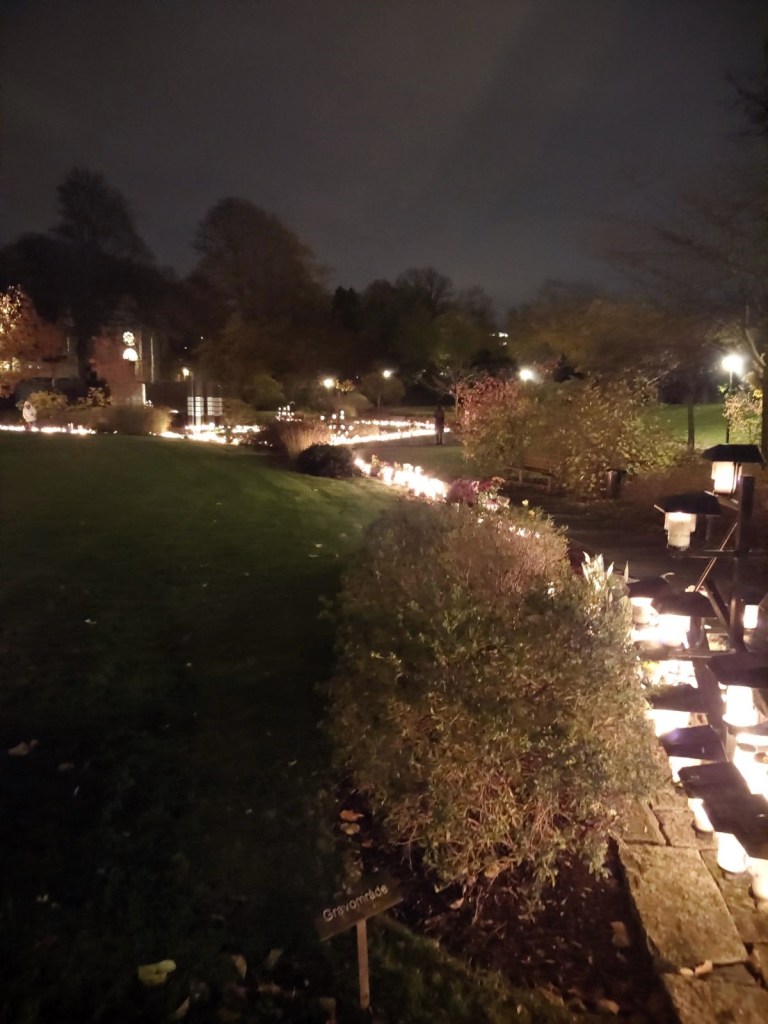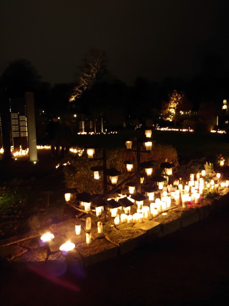Några som var med brukar alltid ta en promenad runt på kyrkogården just den här kvällen för att titta på alla ljusen. I år följde alla med och det var magiskt att se alla ljusen. Framförallt minneslunden. Blir även så lycklig av att se alla andra gravar med ljus på. Lyser verkligen upp. Mycket folk som rörde sig där och klockan var ändå halv tolv på kvällen. Helt klart en levande kyrkogård, och jag bara älskar den,