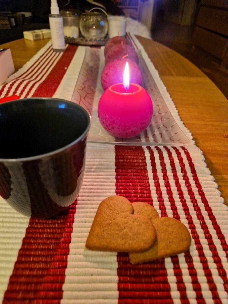 1. Adventsfika är en återkommande tradition. Men vi har flyttat den från eftermiddagen till efterrätt efter lunchen eftersom det är bättre för mig än att äta kakorna på fastande mage. Men njuter gör jag ju ändå, oavsett när jag äter det 🙂 Har inte tänt ljuset än, det blir till middagen.