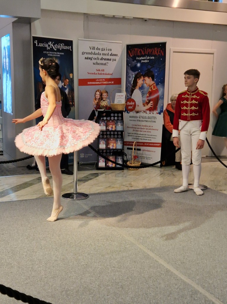 de stora varuhusen brukar alltid fixa lite mys och igår så uppträdde två ungdomar från balettskolan och dansa från nötknäpparen. Naturligtvis så stannade vi till och tittade. Hann även med deras julskyltning. Så uppskattat.