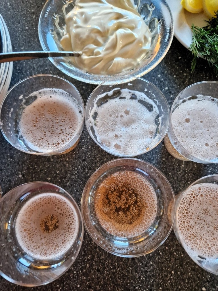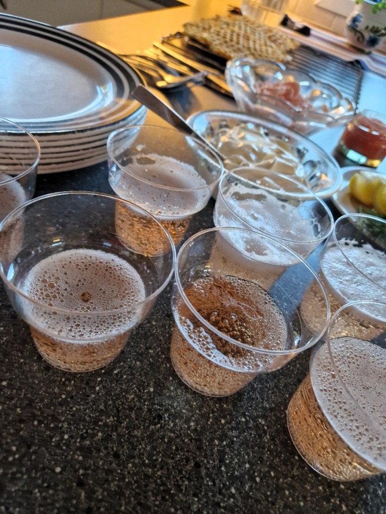 Vi lyxade till det och åt våfflor med cremefraiche, röd rom och räkor. Drack mousserande alkoholfritt vin till. Då personalen tog med så mycket själva kunde vi äta tillsammans och det gör så mycket. Det är så uppskattat och har varit våran grej. Inte varje helg, men ibland och visst är alla värda lite festligheter ibland? Det är så vi lyxar till det.