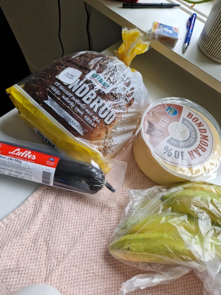 Blev så glad då jag hittade bondmoran 10% för under hundra kronor kilot. Min man äter en del ost, och han gillar verkligen den här så mycket. Lite korv, bananer och frukt blev det också. Halva priset på bananerna mot vad ICA tar.