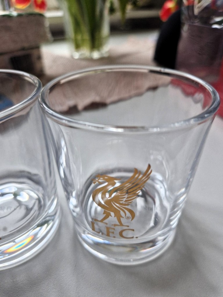 Hittade whiskyglas till mannen med favoritfotbollslaget Liverpool. Kul grej att ge bort och det kan jag väl få göra åt honom tänker jag. Gillar att köpa små presenter då jag är ute,