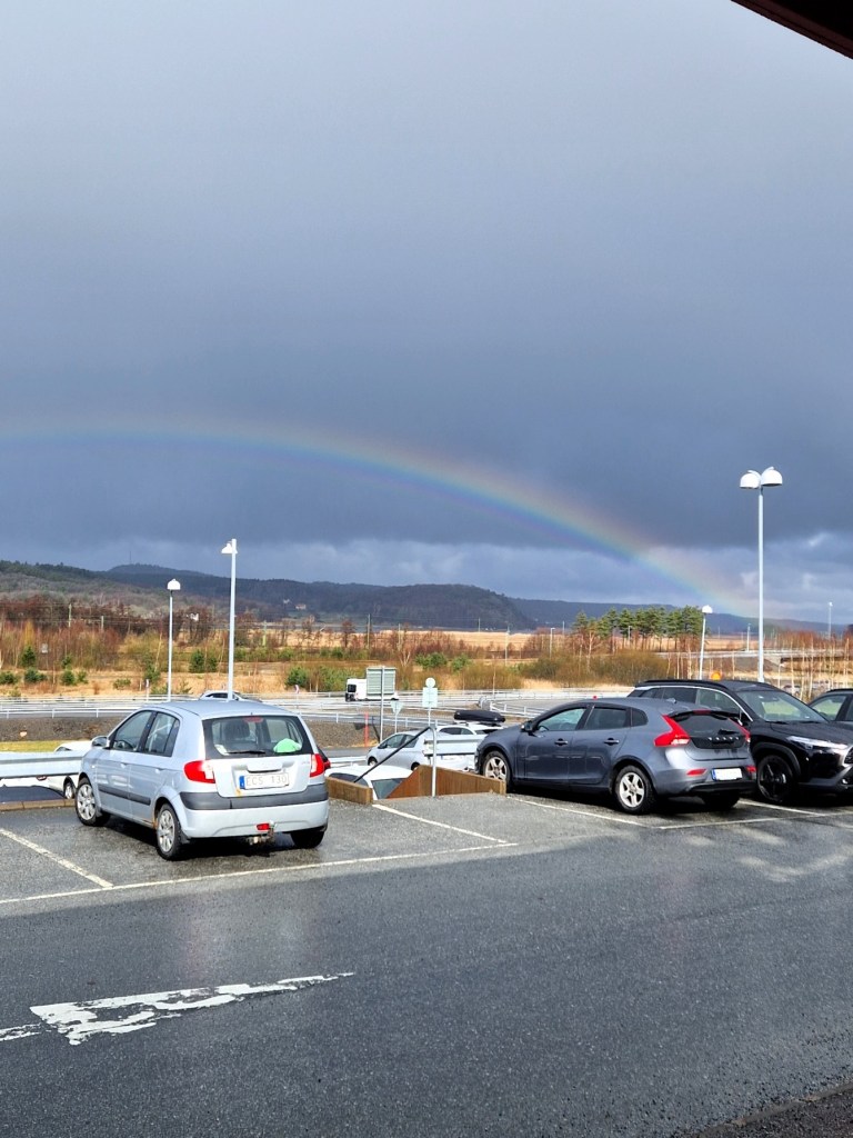 vi fick igår. Det regnade, haglade och däremellan sken solen. Rena aprilvädret känns det som. Mitt upp i allt såg vi den här vackra regnbågen. Trodde aldrig att jag skulle kunna fånga den på bild, men det funkade ju trots min dåliga mobilkamera.