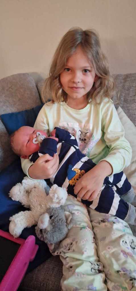 Där för sju år sen efter att vi höll på att hjälpa dom att flytta, och hon åkte in på förlossningen fram och tillbaka en hel del kom äntligen den här vackra tjejen ut.