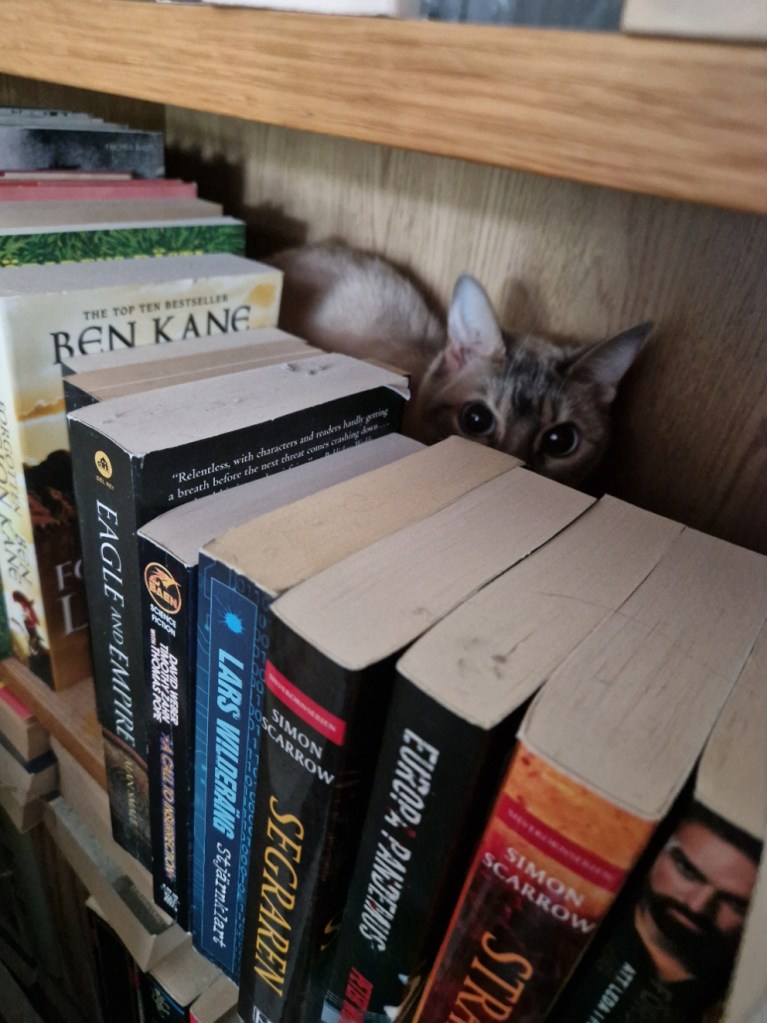 Berättade ju om kissen vi passar och hur skygg hon är. Det var bakom de här böckerna vi hittade henne sist hon var borta. Då hade vi rivit ut listerna från köket, plockat isär badkaret, letat igenom garderoberna utan resultat. Smart katt det där. Det är hon och min man som älskar böcker inser jag.