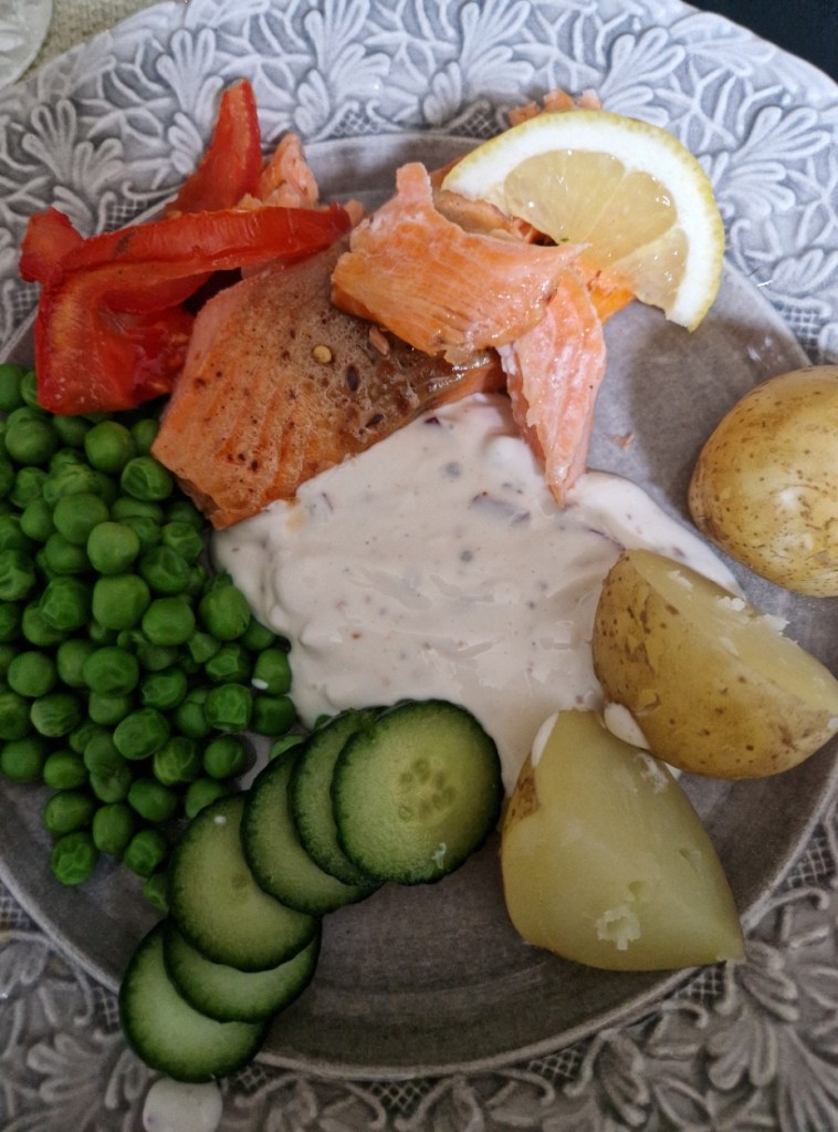 Efter mötena är man alltid så pepp på att laga bra och god mat. Åkte och handlade och kom hem med lax bland annat. Lagade den i air-fryern och det blev så bra. Hur smidigt blev inte detta? Potatis. kall sås på chili och citron gjord på fettfri yoghurt. Allt som allt 2 SP och så mätt jag blev.