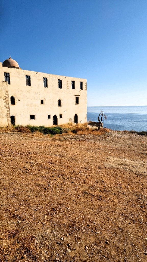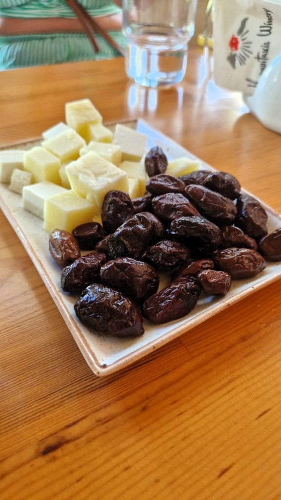 Sista stoppet var för lunch och bad. Då jag läste recensionerna för resan så var det just maten som fått sämst betyg. På sådana här resor har jag aldrig fått gourmetmat, men detta var absolut inte dåligt. Grekiskt sallad till förrätt, kyckling och galet god potatis till huvudrätt och till efterrätt melon och någon liten nötig kaka. Som dryck serverades ett glas vin. Samtidigt gjorde nog sällskapet lunchen extra trevlig. Vi hamnade vid samma bord som två blivande TUI guider. Väldigt trevliga och tiden bara sprang iväg.