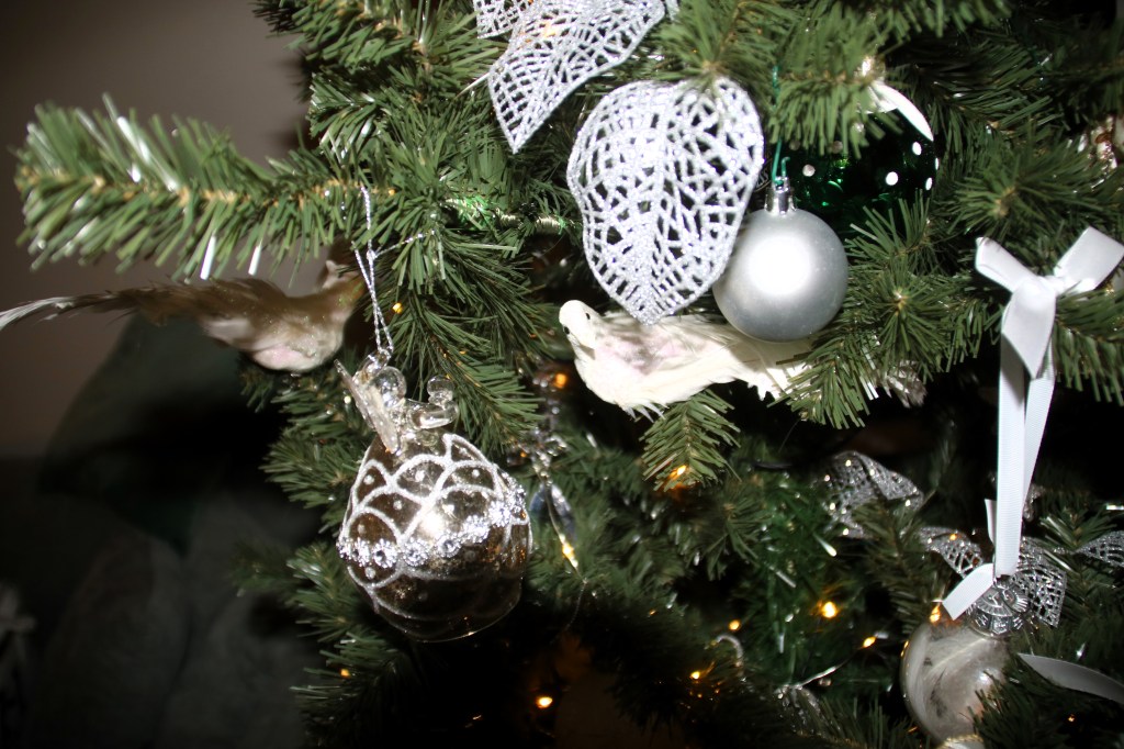 Ja, jag vet. Det är tidigt, men nu är det gjort. Granen är klädd. Brukar alltid ha teman på granen varje år, och hade en tanke. Det blev inte så utan en helt vit gran. Glitter har vi tröttnat på men vill ändå ha något som lyser upp. Hittade glittriga löv på newport som vi köpte. Det är inte de billigaste, men med drygt tjugo procent i rabatt så blev det ändå helt OK i pris.