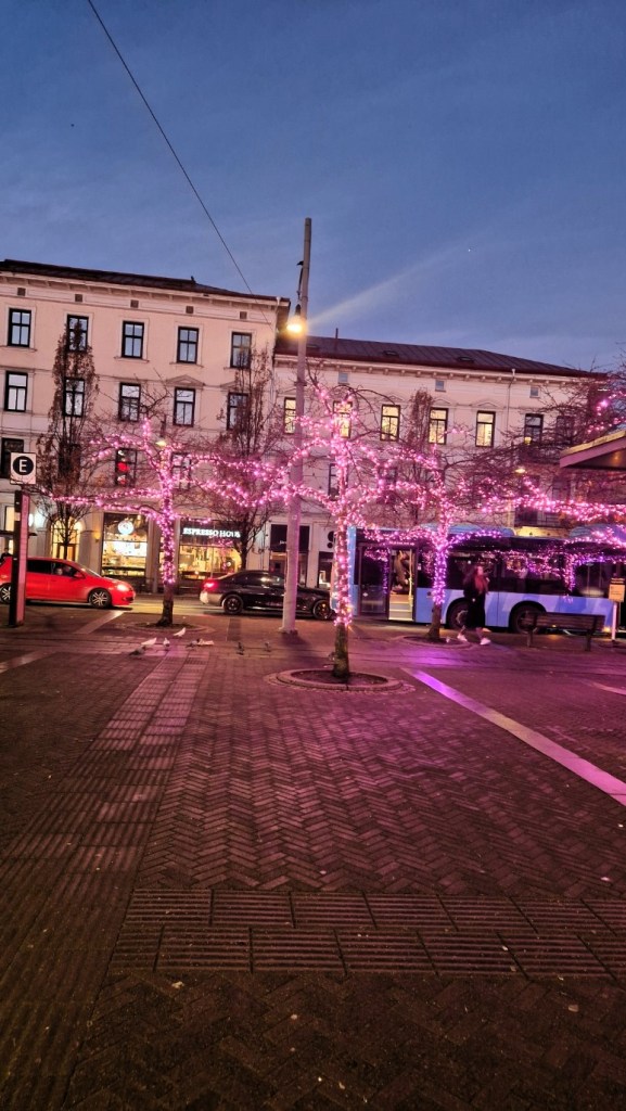 Det är så fint på järntorget den här tiden. De rosa lamporna är magiska. Tyvärr är min mobilkamera ganska dålig så lyckas inte fånga det så som jag önskar.