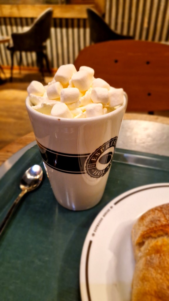 Eftersom jag hade så gott om tid tog jag mig en fika innan. Det blev varm choklad med grädde och mashmallow och en macka. Inte det nyttigaste, men så gott. Blev sittande där så jag tappade tiden. Nu är det så att min frisör inte är den bästa att passa tider heller. Samtidigt tänkte jag att om jag för en gång skull är sen är säkert han tidig. Nu blev det inte ens så, men vi skratta gott åt det efteråt.