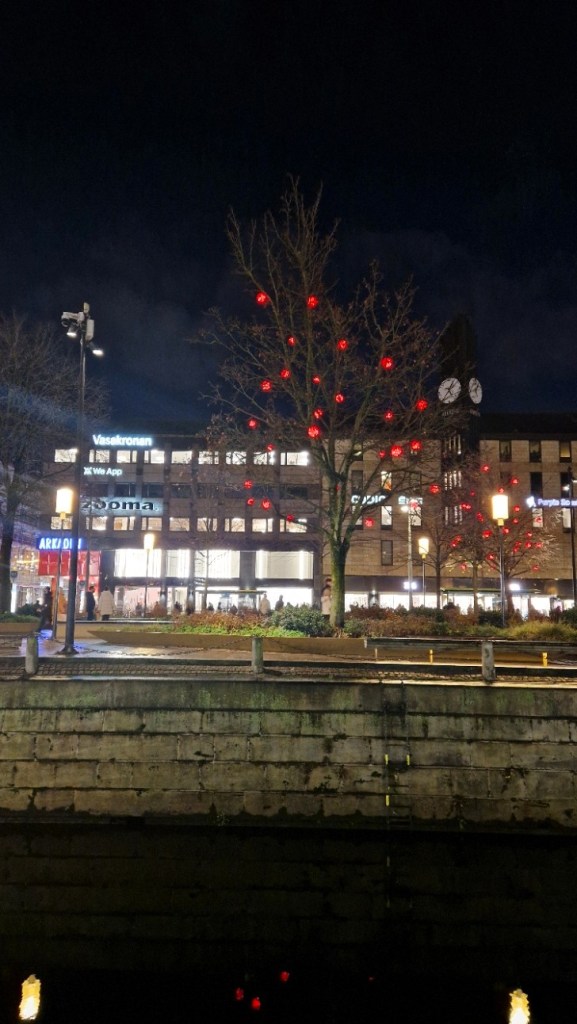 Det är så fint då den har kommit upp i stan. Just i brunnsparken har dom röda bollar i träden och det lyser upp så fint då mörkret faller. Jag blir verkligen så glad över att se det.