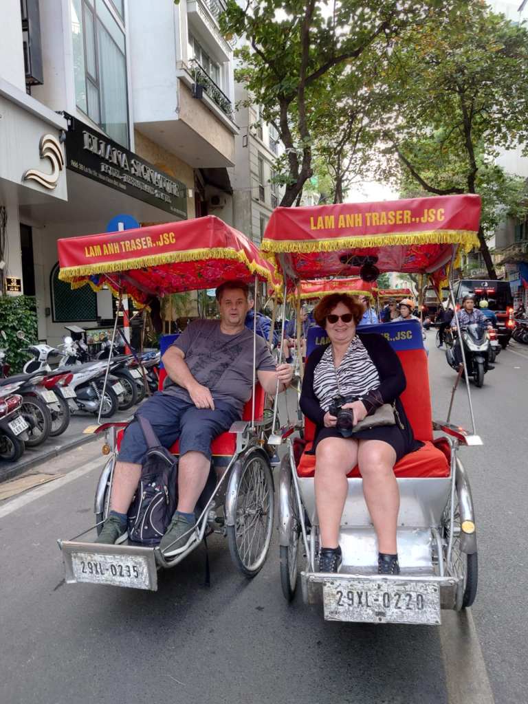 Känns lite konstigt att skriva det då klockan är kvart i tre där jag är nu. Det här blir vår första riktiga dag i Hanoi och första utflykterna är avklarade. Nu lite siesta på rummet innan vi ska på vattenteater och middag. För att ni inte ska tröttna totalt på mig kommer jag dela upp inlägget i flera. Först ut är vår tur med en cykeltaxi. Det var inget Rolf hade planerat utan blev en spontanutflykt idag. 8 på morgonen kom bussen och hämtade oss för en kort färd till cyklarna. Där väntade 28 ”taxicyklar” på oss för att ta oss runt på Hanois gator. Som lokalguiden sa. Är ni rädda för trafiken så blunda.