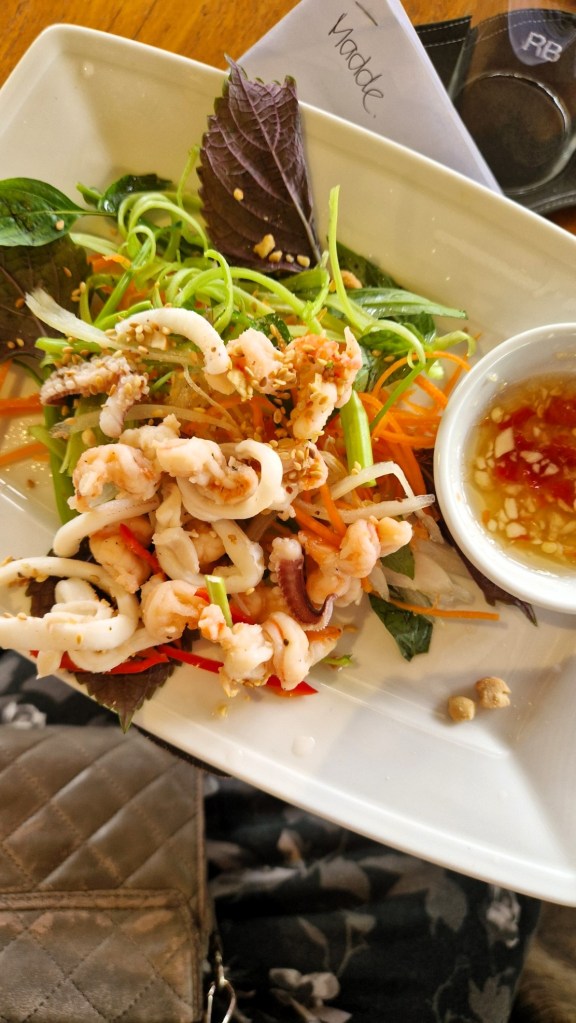 Det var det vi skulle göra idag. Laga vår egna lunch under ledning av en kock. Först visade hon och sen var det var tur att försöka. Började med att laga vietnamesiska pannkakor, för att sen göra vårrullar. Det åt vi på stående fot medans hon berättade. Vid varje station fanns flera som kunde hjälpa till då vi behövde fråga någonting. Väldigt intressant.