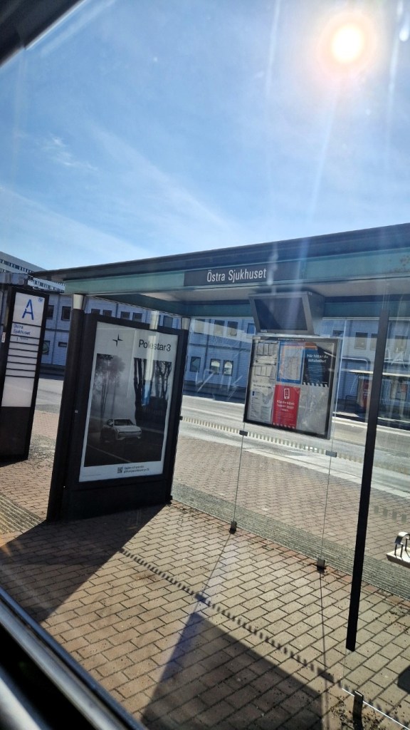 Resan började vid Östra sjukhuset. Det ligger i Björkekärr mot Partille. Ett av våra 3 stora sjukhus här i stan tillsammans med Sahlgrenska och Mölndal. ( ja jag vet, Mölndal är grannkommunen). Det är även här Drottning Silvias barnsjukhus ligger. Lätt att ta sig hit både med bil och kollektivtrafiken. Man slipper in och snurra i stan vilket jag uppskattar. Tog mig en glass i solen medan jag väntade på att påbörja resan.