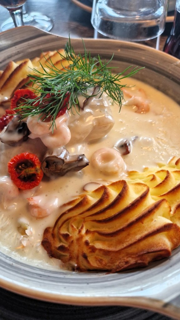 Vad hände med vädret då? Rena höststormarna ute nu. Vill ha sommar nu när vi har semester. Min man skulle uträtta lite ärenden i stan så jag hängde på. Tog en kaffe medan jag väntade på honom. En kompis ringde så vi pratade bort en stund. Tog en promenad till Haga och Sjöbaren för lunch. Deras soppa is to die for, men idag ville vi ha fiskgratäng. Även den galet god. Nu orkade jag inte allt, och såsen var nog lite för fet.. Behöver inte äta allt, och det är helt OK att lämna. Gillar ju att gå ut och äta och fika, men just nu kanske det inte är prio ett. Lite tråkigt, men så är det.