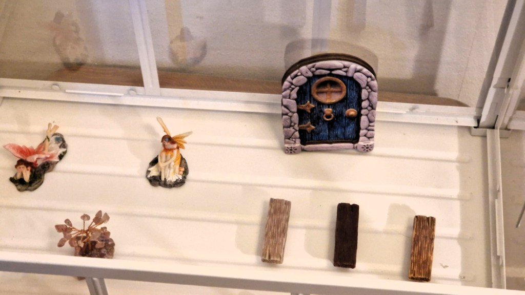 I vintras hade jag jultema i mitt tittskåp. Nu fick älvorna flytta in. Tjejerna tycker det är så roligt hemma då dom ofta hittar något ”magiskt” hemma hos mormor. Är det inte stenar så kanske någon tomte eller ett troll tittar fram. Den här gången är det älvorna som fått ta plats.
