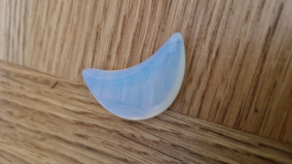 Opalite är en syntetisk opal. Den jag fick med i mitt kit har formen som en måne. Stenen ska jobba med det känslomässiga, kvinnliga, och ordet tillit kommer fram.