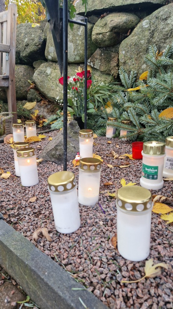 Hämtade upp min man och vi åkte till kviberg där vi först tände ljus för mormor, morfar och moster. Vidare mot minneslunden och tände fler ljus. Mamma och pappa ligger där. Svärmor fick ett ljus där också då hon är spridd i havet. Det är ju de som är så bra med just minneslundar.