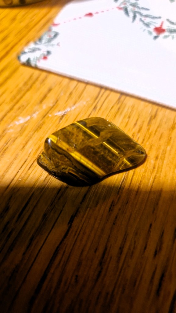 Då var det åter dags att visa innehållet i min kristallkalender. Bakom dagens lucka hittade man ett tigeröga. Både igår och idag så har jag fått stenar som jag känt WOW, det här behöver jag. Under åren har jag dragits till olika stenar, men det är nog lite vad jag behöver här och nu. Det är en jordande sten, som jobbar mycket med de nedre chakrana. Står även för beskydd och balans. Det är egentligen det mest grundläggande sakerna för att vi ska må bra.