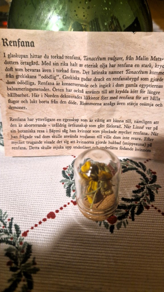I dagens lucka hittade jag renfana ifrån deras örtträdgård. Den doftar starkt även då den är torkad. Renfanan är konserverande och har används sen långt tillbaka. Bland annat i de gamla egypternas balsameringsmetoder. De gamla grekerna drack den för att bli odödliga.