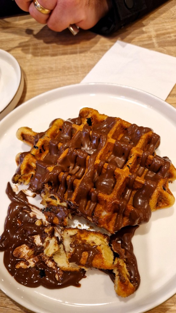 Det blev inte mycket till frukost så en våffla med lite gott på satt som en smäck där vid lunchtid. Min man ville inte ha sa han, men plötsligt hade han egna bestick och halva min var borta. Vad hände?