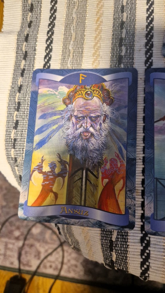 Ansuz drog jag då. Den står för kommunikation, visdom, ande/livsande eller gudomligt budskap. I en runläsning kan det stå för samtal, någon talar sanning inspiration