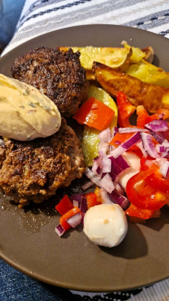 Det blev nötfärsbiffar, med klyftpotatis och röd mozzarella sallad. Jag hade alltså tomat, paprika och rödlök samt ost i den. Så gott. Äter små portioner, men äter lite oftare. Det är väl precis så man ska göra enligt de som kan.