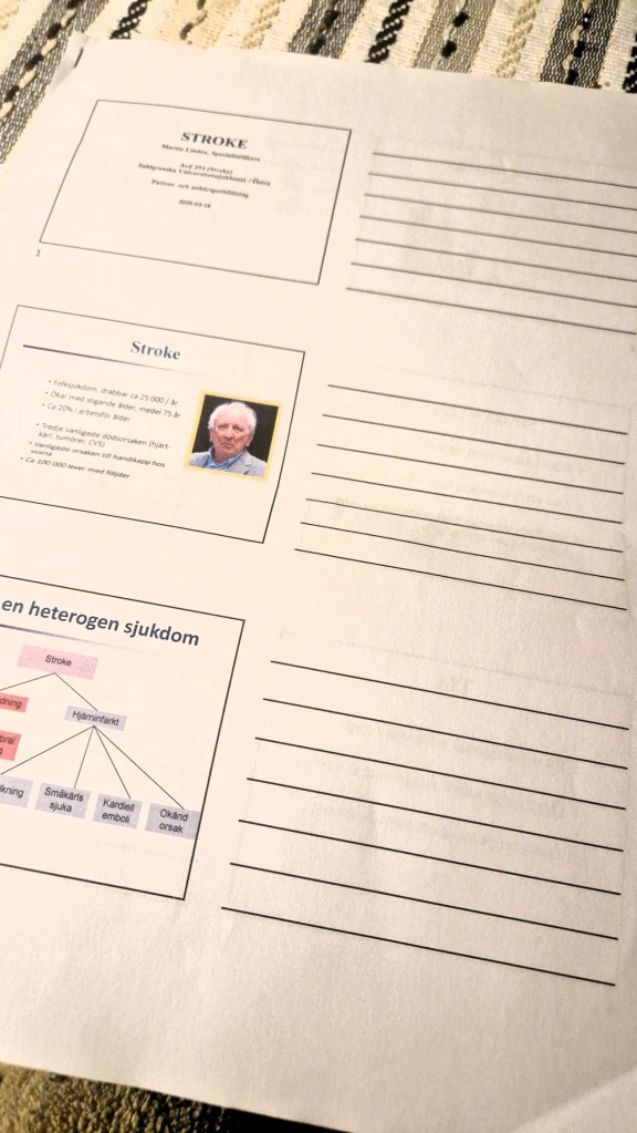Igår kväll startade strokeutbildningen vi ska gå på. Första delen handlade om vad en stroke är för något. Vilka skador det kan ge och hur man ska agera. Till det hur vården fungerar och även rehabträning.