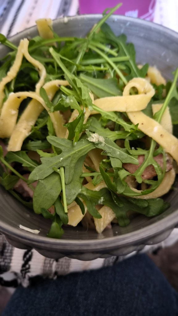 Passa på att handla efteråt och vi var nog båda lite hungriga då vi kom hem. Slängde ihop en carbanara till middag med färsk pasta. Det blev så gott. Det är så enkel mat att göra om man har bråttom. Till det lite ruccola.