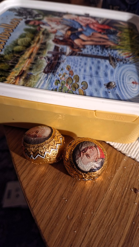 Mozartkulorna och kakburken var båda gula. Precis det jag inte ska äta, men gynnar ändå barnbarnet fotbollslag. Jag blir fet, och hon får åka på cuper.