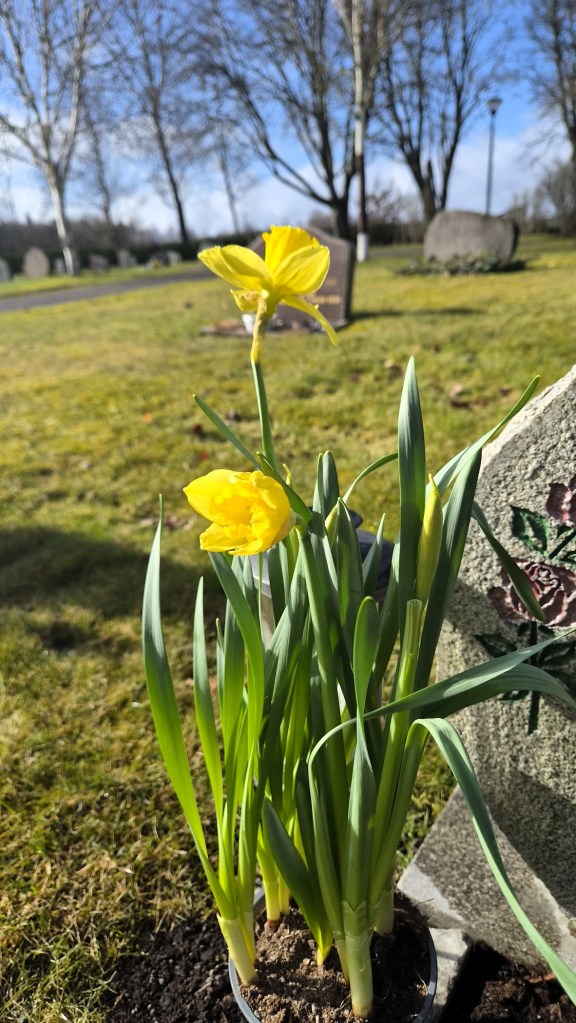 Nästa bild. Påskliljorna jag satt på graven. Det är så jobbigt varenda gång jag åker dit, och trots att det är 6 år i år så kan jag inte släppa fullt ut. Ska nog inte göra det heller, för så fint att kunna åka dit.