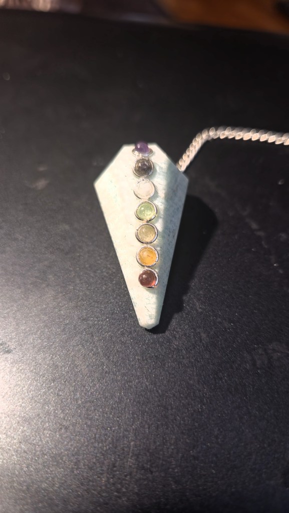 Fick en pendel i amazonit. Ingenting jag har, och har inte ens hört talas om stenen innan. Den står för lugn, balans och kommunikation. Gillade den direkt och han berättade att han såg den snabbt och bara kände att den ska Madde ha. Den svagt turkosa färgen är otroligt vacker.