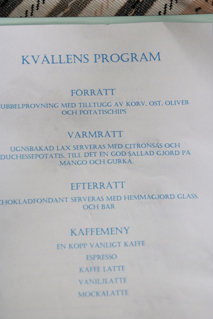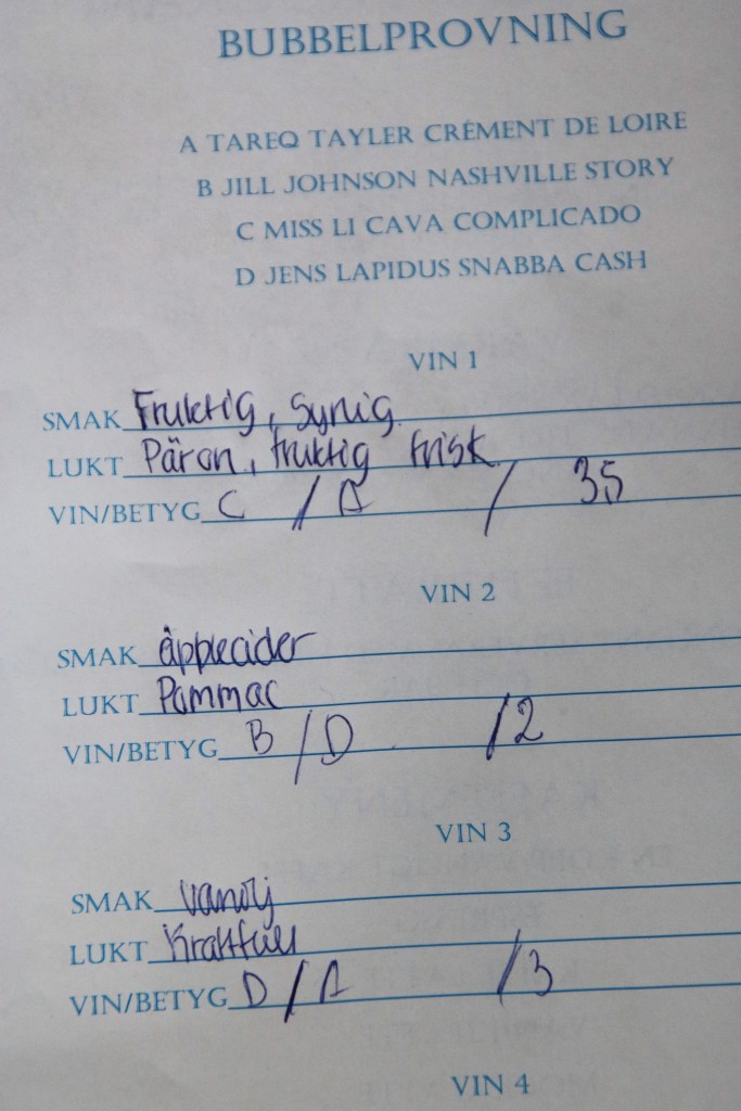 Hur som helst så fick alla ett program då de kom med kvällens meny, samt ett enklare protokoll över vilka viner vi skulle prova. För att göra det lite enklare så stod vinerna med, men ingen, inte ens vi hade en aning om vilka som gömde sig bakom flaskorna då vi virat runt folie, och flaskorna var snarlika i form. Lite tilltugg till detta så blev det perfekt. Mycket bra diskussioner och det testades och gissades hej vilt.