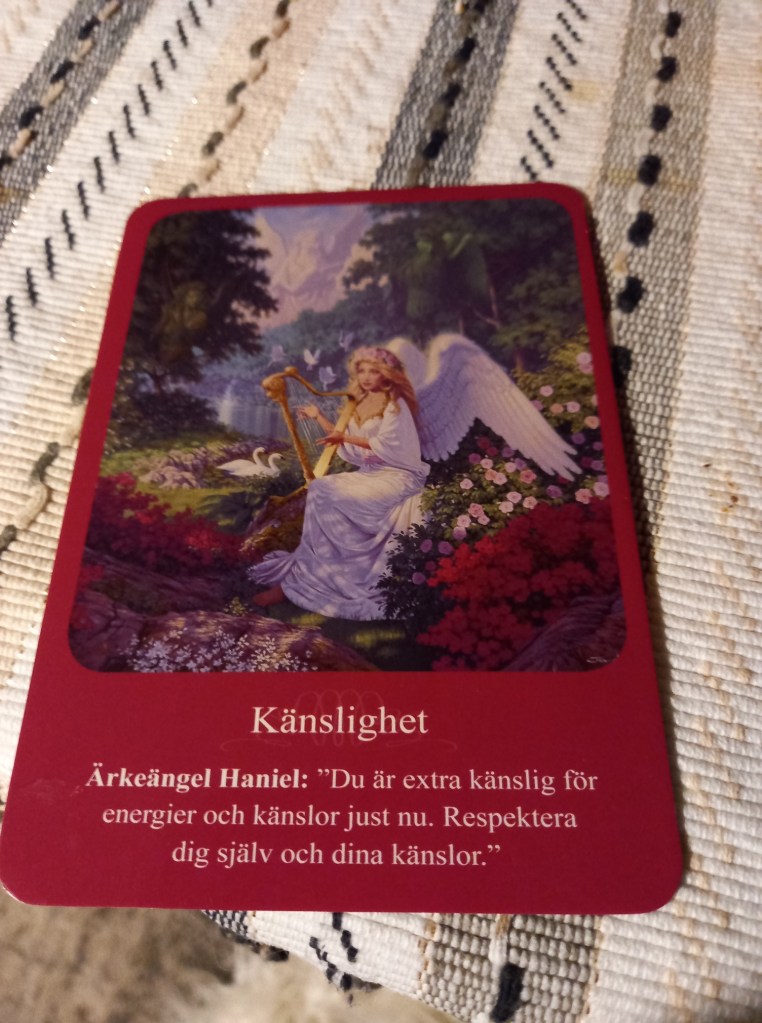 Nästa kort jag drog var från min änglalek. Känslighet kom upp. I början läste jag bara budskapet, utan att titta så mycket på kortet. Det jag dras till på kortet är betydligt viktigare. Känslig har jag alltid varit, nu mer än någonsin kanske. Behöver få lugn och ro runt omkring mig, Naturen har alltid hjälpt mig där, ändå är jag en storstadstjej. Då jag tittade på korten var det första jag såg de tre änglarna runt omkring Haniel. Har kanske några som vakar över mig, undrar bara vilka.