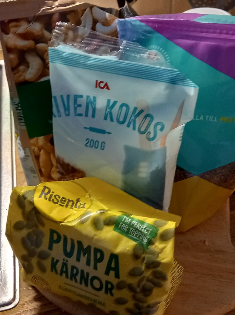 Jag blandade i havregryn, nötter, cocos, pumpakärnor, och linfrön. Till det lite cocosolja och lite honung för sötmans skull. Rostade allt i ugnen, och var noga att kolla hela tiden.