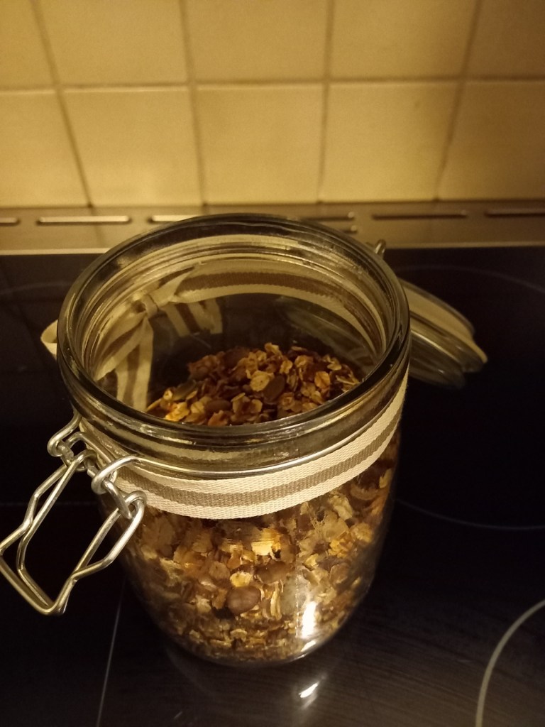 För första gången gjorde jag egen musli och blev väldigt nöjd förutom om att det hann bli lite för rostat. Det gick fort så nu har jag lärt mig att röra runt lite oftare än vad som stod där.