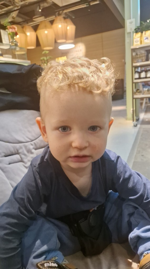 Tog en fika under tiden och då jag skulle lämna brickan började en dam prata med mig. Frågade om lockarna i hans hår. Han lyckades charma henne så det sista hon sa var att han kommer charma flickorna då han blir lite äldre. Ja chansen är stor och det börjar redan. Växer man upp i en tjejliga så blir det nog så.