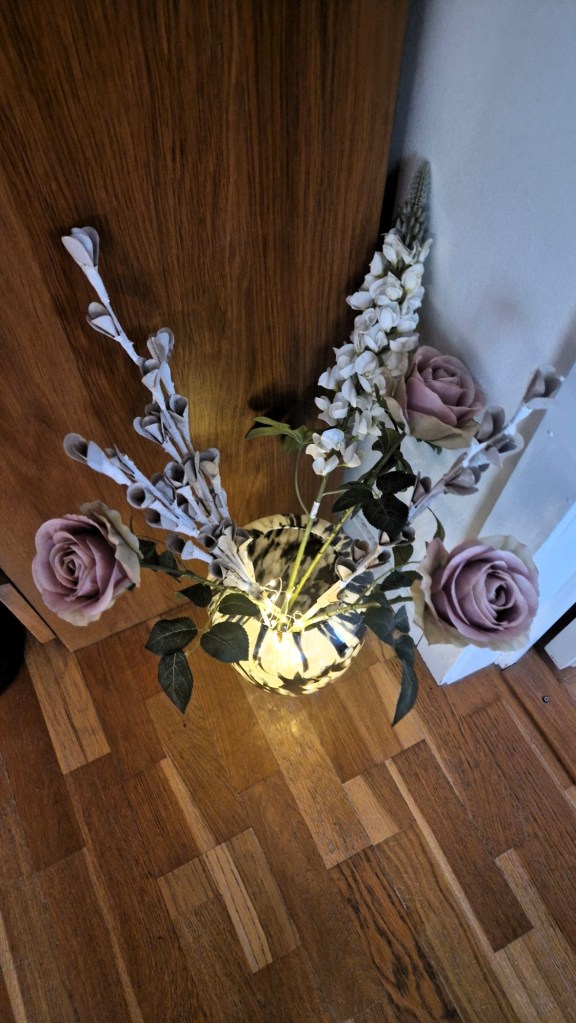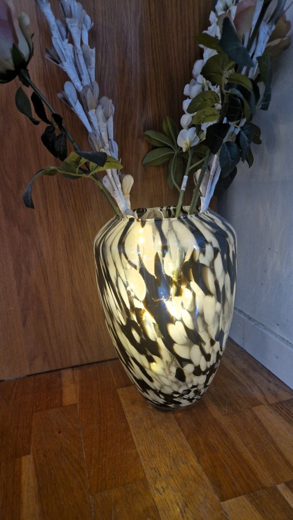 Jag har så dåligt med ljuskällor här hemma. Det är ändå så mysigt tycker jag. De sista åren har jag slängt i en ljusslinga i en rätt så genomskinlig vas. Blir helt klart som en lampa. Nu gör sig inte bilderna den helt rättvis, men visar ändå. Vasen lyser upp så mycket under den mörkare tiden. Blommorna kommer bytas ut närmare jul.