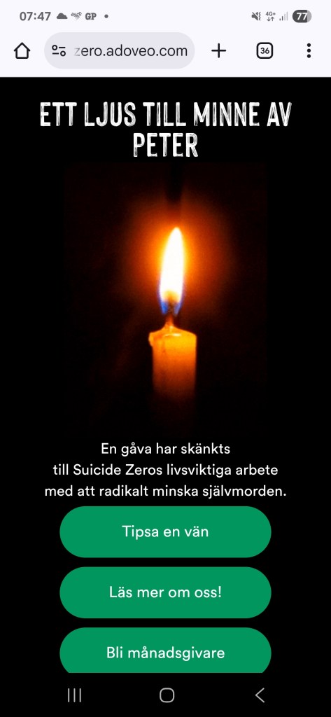 Vill man stötta det förebyggande arbetet mer så finns suicide zero. Jag skulle bli så tacksam om mina läsare ville bidra med någonting. Många tror att det måste vara så mycket, men om många gav 25 kronor blir det mycket. Allt för att ett litet barn inte ska behöva förlora en förälder. Vill inte heller att någon ska förlora sin partner, sitt barn, sin vän eller kollega.
