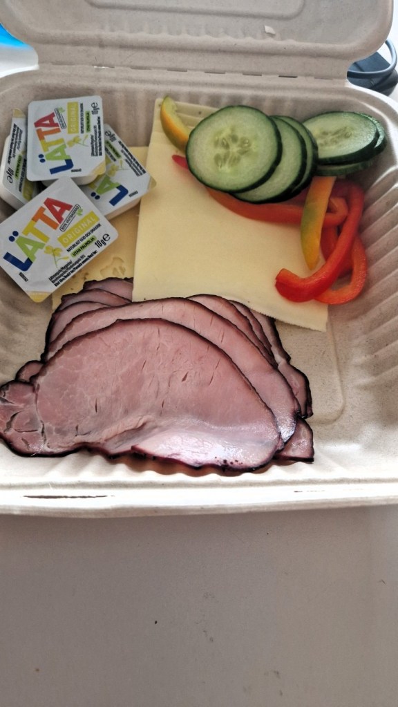Igår uppdaterade jag innan frukosten så tänkte berätta lite om den. Vi kan väl börja med att Gekås är Gekås. Frukostpaketet man får hämta innehåller det många äter som kanske helgfrukost hemma. Då det är take avay så blir man avbockad och får en påse samt en kartong till påläggen. Det är tyvärr begränsningar på vad man får ta och jag förstår varför. Du kan tänka dig vad folk hade plockat på sig om man fick ta obegränsat. Du börjar med att välja 2 frallor var. Därefter får man hämta yoghurt och juice. Dags för pålägget och finns ost och skinka att välja mellan. Lite grönsaker samt smör då. Likaså får man ta varsitt ägg. Det sista är den varma drycken. Här finns te, kaffe och varm choklad. I vårt paket ingår frukosten, annars kostar den 89 kronor. Tror dom tog 49 för kaffe och macka.