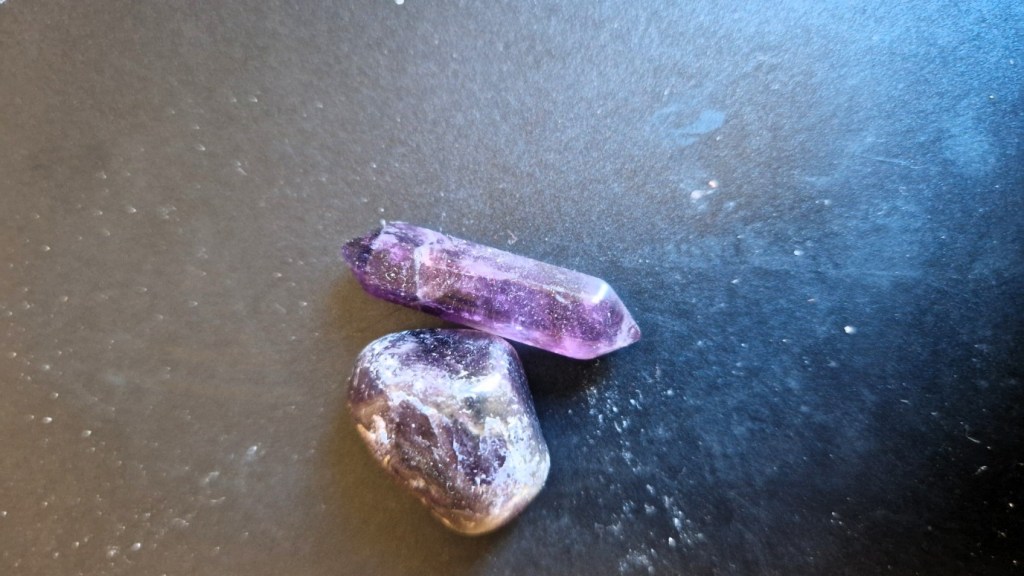 I mitt kit så fick jag ametist, och den kommer upp vid flera tillfällen. Den sägs betyda icke berusad, så en sten för klarhet och visdom. Jag har alltid tyckt om den, tillsammans med citrin.