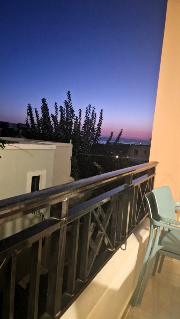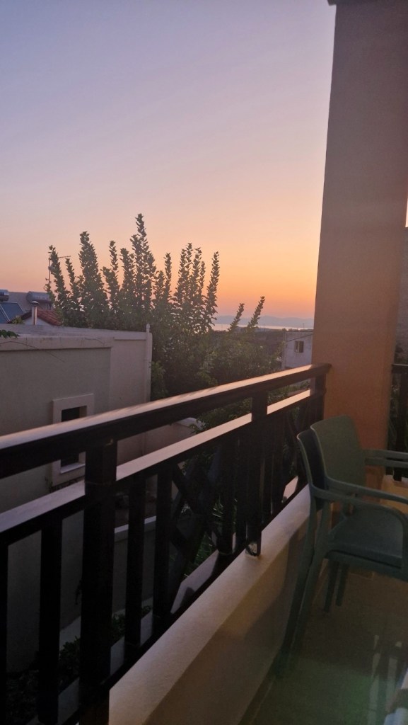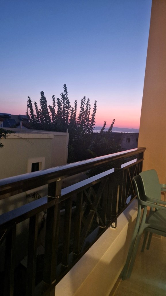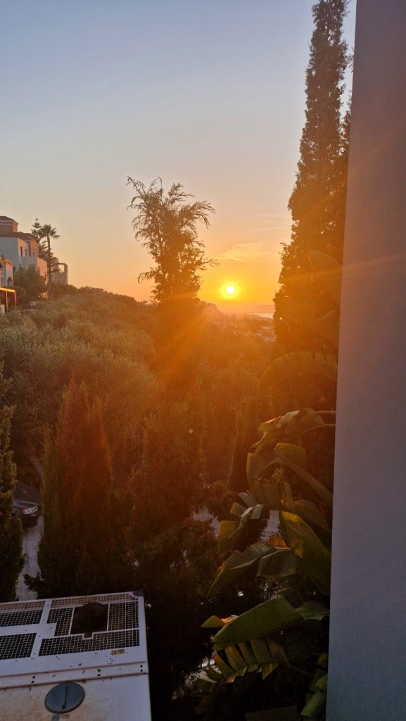 Här är utsikten från balkongen. Där mellan husen har vi havsutsikt. Likaså på bilderna från soluppgången. Hela områden är uppbyggt som en liten by kan man säga. Gångar och även två mindre bilvägar genom området. Nu är det ingen trafik där direkt förutom taxibilar till receptionen. Vi har även en liten minimarket med väldigt bra priser i. Annars brukar de butikerna ta överpriser. Vi köpte 6 stycken 1.5 liters vatten för 2 euro. Visst hade vi kunnat fylla på flaskor i baren, men min man vill gärna ha på rummet.