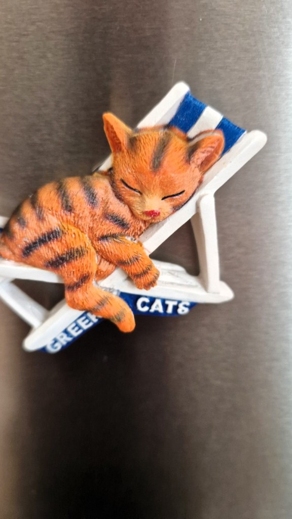 kylskåpsmagneten med katten symboliserar vår resa. Ni såg ju alla katter vi stötte på där och den var så passande.