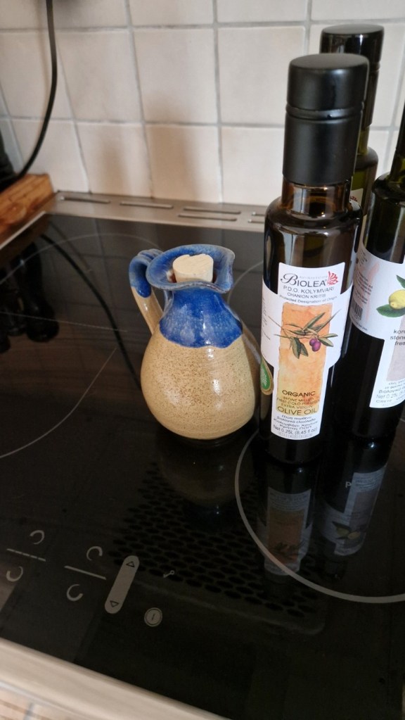 Tänkte visa lite vad vi handlade på Kreta, vi som aldrig shoppar. Vi köpte olivolja ifrån olivgården vi var på. Såg samma olja i butik och insåg hur lite vi betalade då vi var iväg. Vi köpte även en liten kanna och tänkte vi kunde ha lite olja i den.