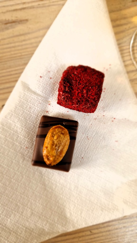 Där i mitten kände vi att det skulle vara gott med något sött. Då vi läste vilka ställen vi skulle besöka så kände vi lite OK bara. Två praliner… Ni förstår, men jag tar tillbaka det. Stoppet där blev en höjdpunkt för oss. Lugnt och stilla och det där lilla behövdes. Till det, lite dessertvin och hantverksgjorda praliner går inte av för hackor. Vi bedömde även servicen. Kom in, direkt kom en personal fram och sa att jag såg era armband, och önskade oss välkomna. Det där oväntade blir så bra.