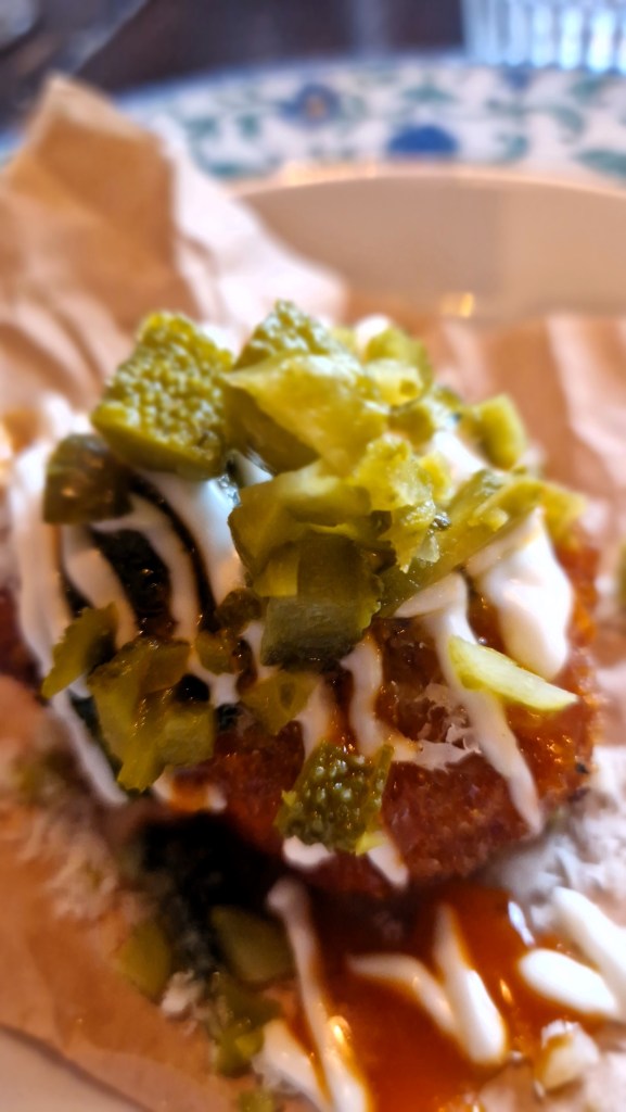 Näst sista stoppet hade vi aldrig hört talas om. En liten krog, och där skulle vi bli serverade sötpotatisbollar. Min man äter inte sötpotatis och han kände bara att det skulle bli sådär. Så fel vi hade, Återigen fantastiskt mat. Till det köpte vi ett orange vin. Har sett det tidigare, man aldrig testat. Helt klart annorlunda, men väldigt gott, I baren berättade hon att dom brukar ha 60 gäster per dag ungefär och idag blev det 340 stycken. Lite rörigt, lite litet, men tyckte dom lyckades extremt bra ändå. Maten kom ut och smakade fantastiskt. Personalen jättegulliga trots att det märkes att dom inte var vana med det här tempot. Återigen en positiv överraskning.